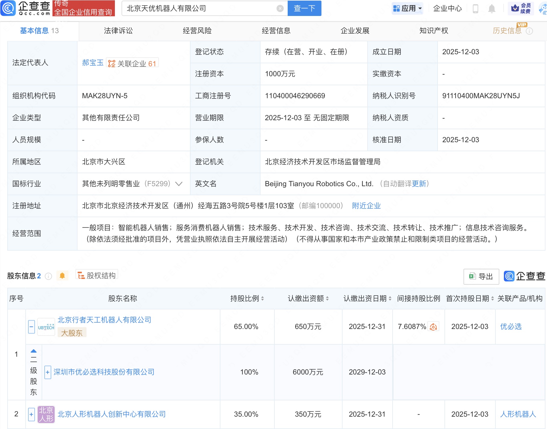 近日,北京天优机器人有限公司成立,法定代表人为郝宝玉,注册资本1000万人民币股票跟投平台,经营范围包括智能机器人销售、服务消费机器人销售、信息技术咨询服务等。企查查股权穿透显示,该公司由优必选(09880.HK)旗下北京行者天工机器人有限公司、北京人形机器人创新中心有限公司共同持股。